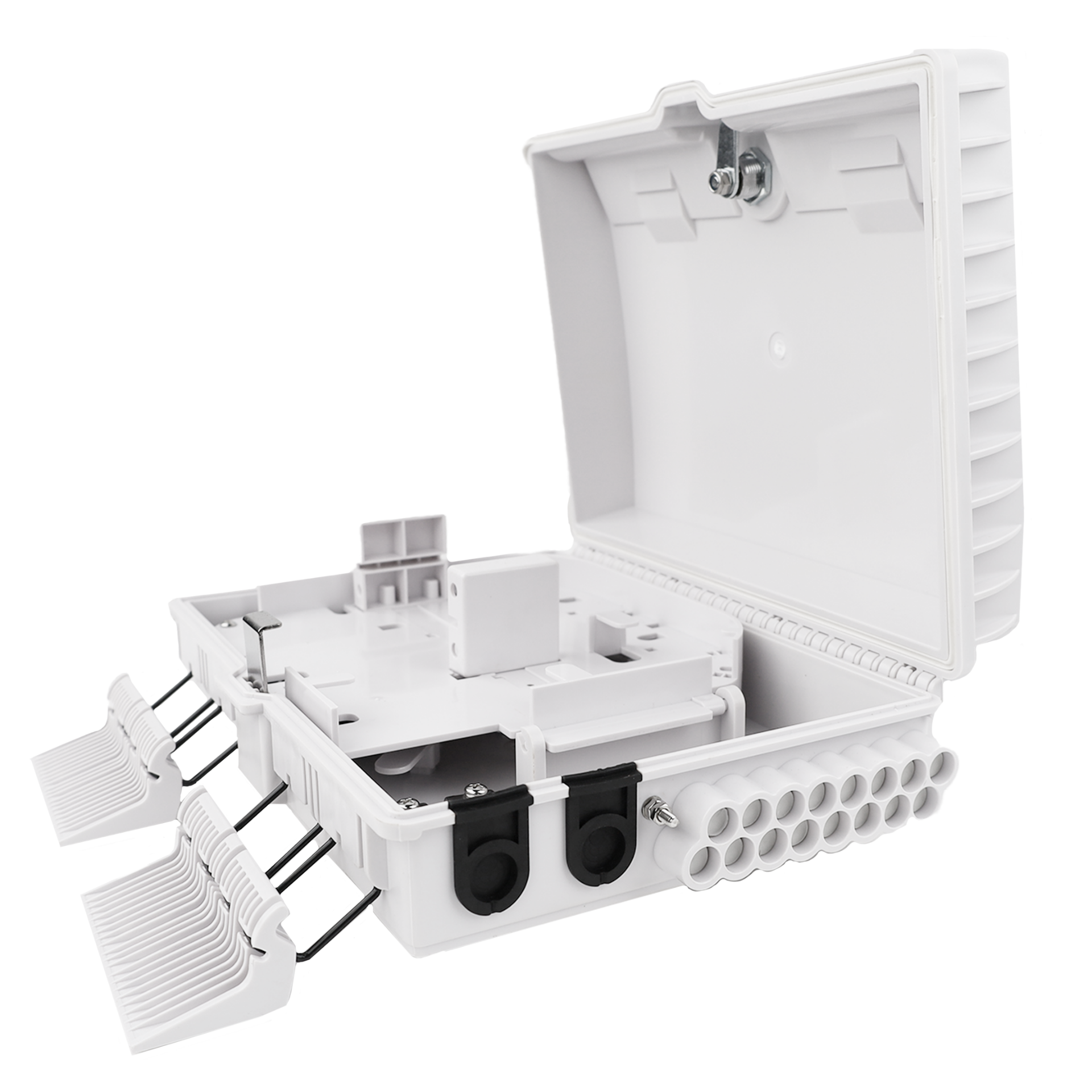 The FOTB-X21E termination box is engineered for reliable fiber management in FTTH and access network deployments. It features 2 input ports for cables up to 16 mm and 16 output ports for drop cables up to 3 mm, with a total splice capacity of 16 fibers. This enclosure supports 1x8 and 1x16 PLC splitters as well as LGX-type splitter boxes for versatile signal distribution.