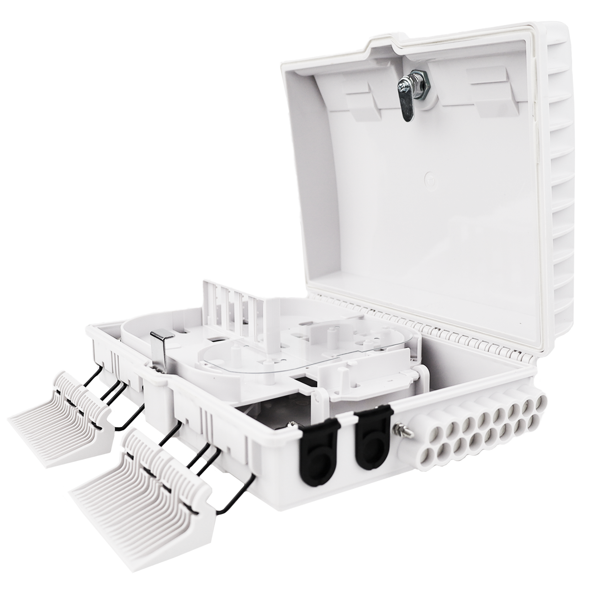Constructed from rugged PC + ABS material with an IP54 rating, this lockable enclosure provides reliable protection against dust and moisture, suitable for both indoor and sheltered outdoor environments. It supports up to 16 SC simplex or LC duplex adapters (flanged or non-flanged, sold separately) and includes a wall mount kit for convenient installation.