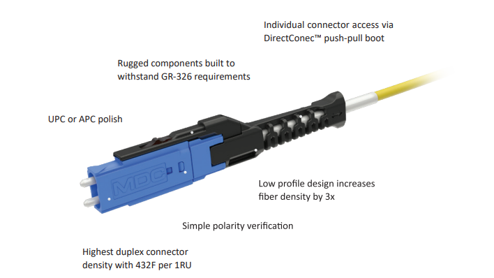 US Conec's ELiMENT® MDC connector is a Very Small Form Factor (VSFF) duplex optical connector designed for termination of multimode and singlemode fiber cables up to 2mm in diameter. The MDC connector is manufactured with proven 1.25mm ferrule technology used in industry standard LC optical connectors. Individual connector access even in the most dense environments is easily accomplished using the revolutionary DirectConec push-pull boot technology.