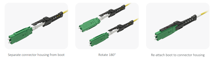 The polarity reversal of the MDC connector does not expose or twist delicate fibers. To change polarity, pull the boot from the connector housing, rotate the boot 180 degrees, and re-assemble the boot assembly back onto the connector housing. Polarity marks on the top and side of the connector and the MDC logo provide notification of reversed connector polarity.