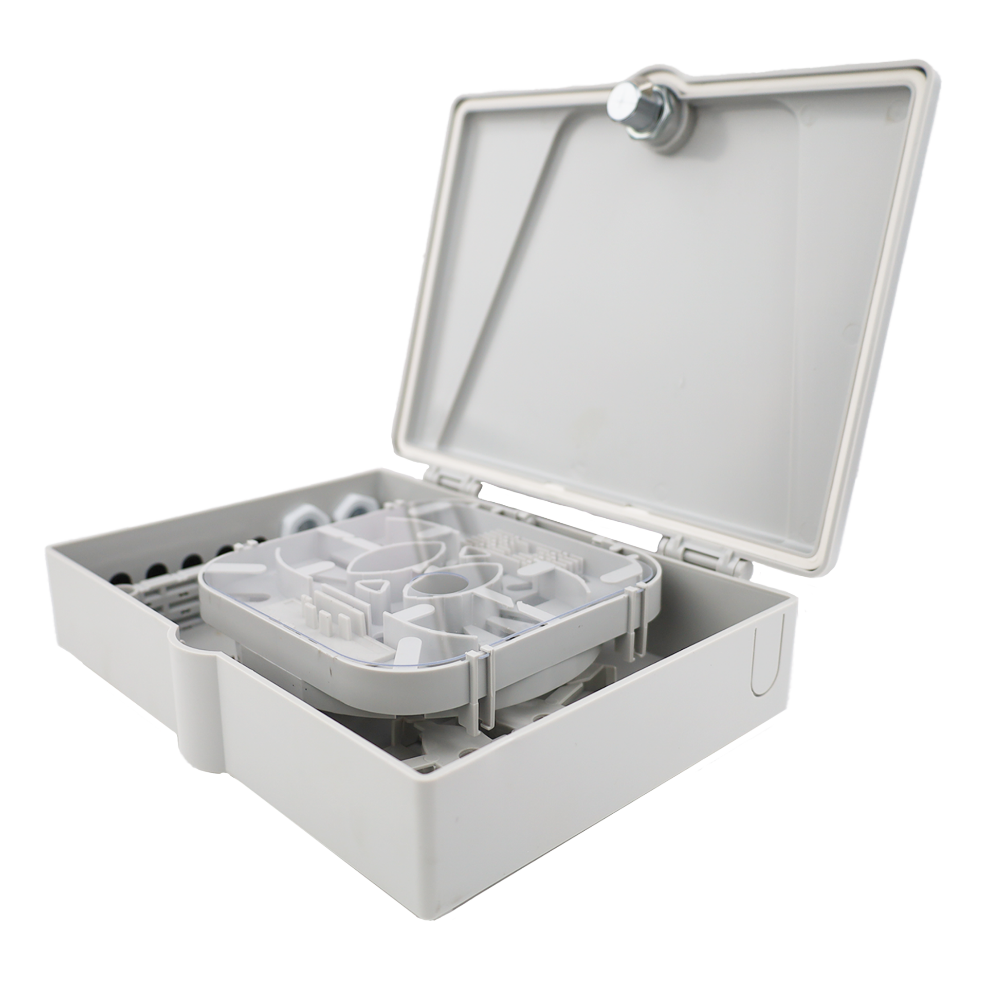 The FOTB-X12B termination box offers secure and weather-resistant fiber termination in access or distribution networks. It features 2 input cable glands for cables up to 12 mm and 12 output ports for drop cables up to 3 mm, with a splice capacity of 12 fibers. The box supports both 1x4 and 1x8 PLC splitters for flexible signal distribution.