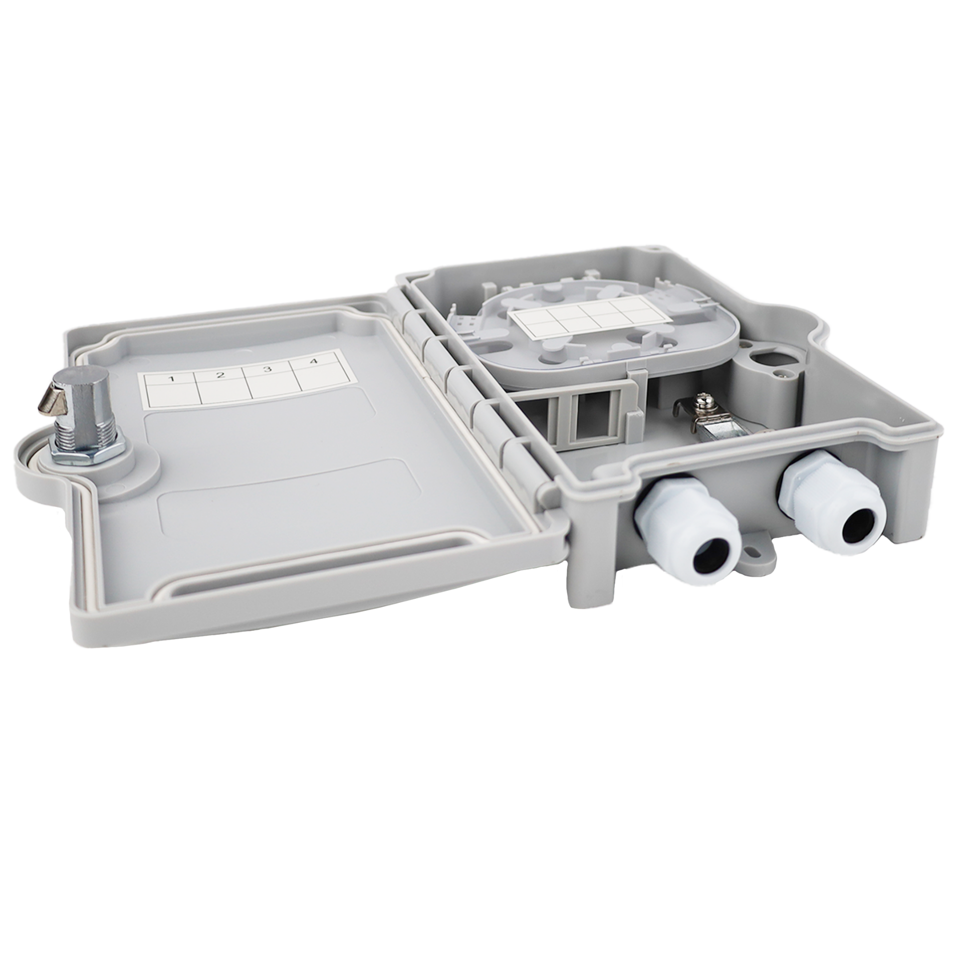 The FOTB-C01 termination box is designed for secure fiber terminations in indoor or sheltered outdoor environments. It features 2 input glands supporting cables up to 12 mm in diameter and offers a splice capacity of 4 fibers, making it ideal for compact fiber distribution needs.