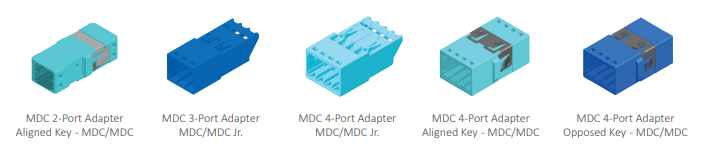 US Conec offers 2-port, 3-port, and 4-port adapters connecting MDC connectors to MDC connectors or MDC Jr. connectors. The 2-port and 3-port adapters are designed to fit through the same panel cutout defined for duplex LC adapters
